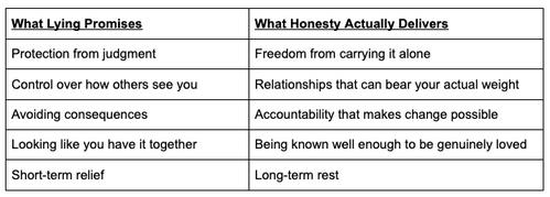 Every one of those silences is a place where transformation stops. And every one of them is a place where honesty — the kind that costs something — makes room for something to shift. The lie that feels safest is almost always "I'm fine." And that one sentence, said to enough people over enough years, can build a life that looks functional and feels like a locked room.